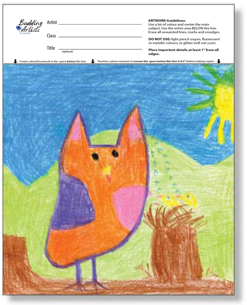 Budding Artists cannot accept artwork larger than 8 1/2″ x 8 1/2″. It is not necessary to paste artwork onto canvas provided.