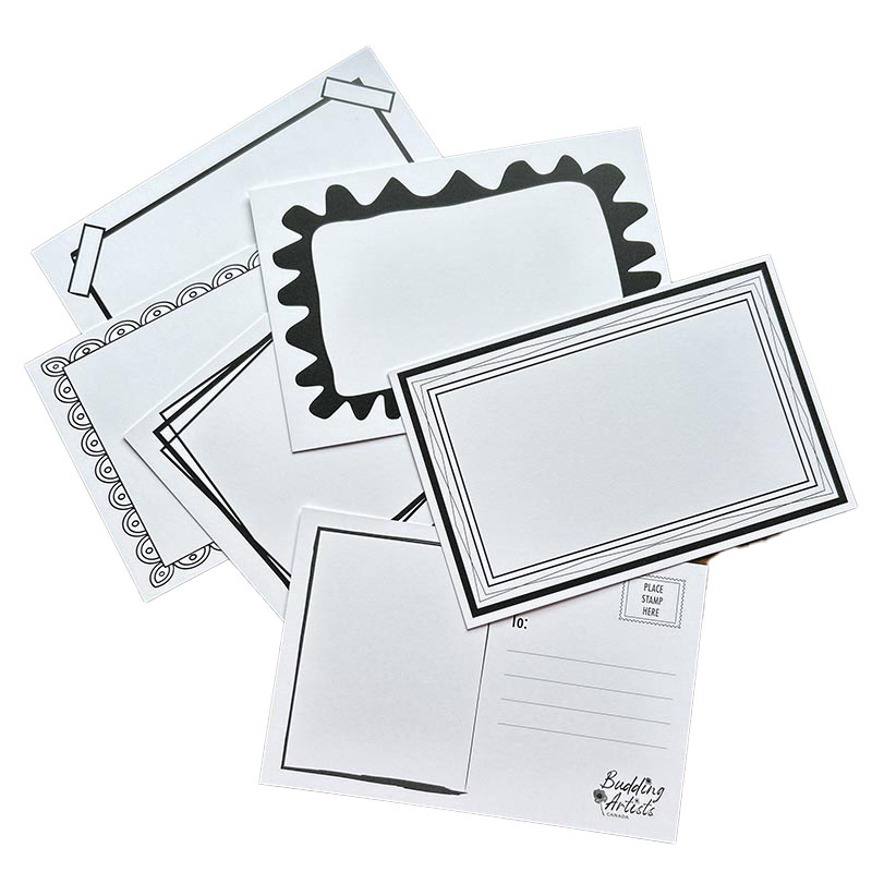 Printed on both sides – the front has 6 different frames, and back has postcard lines.